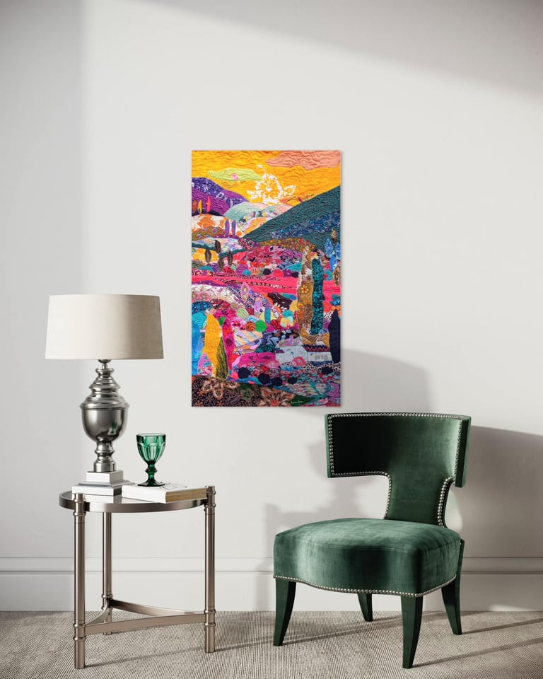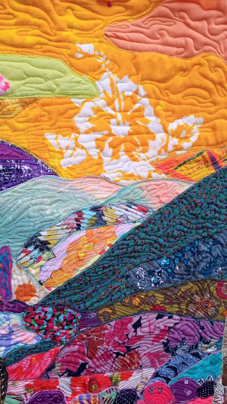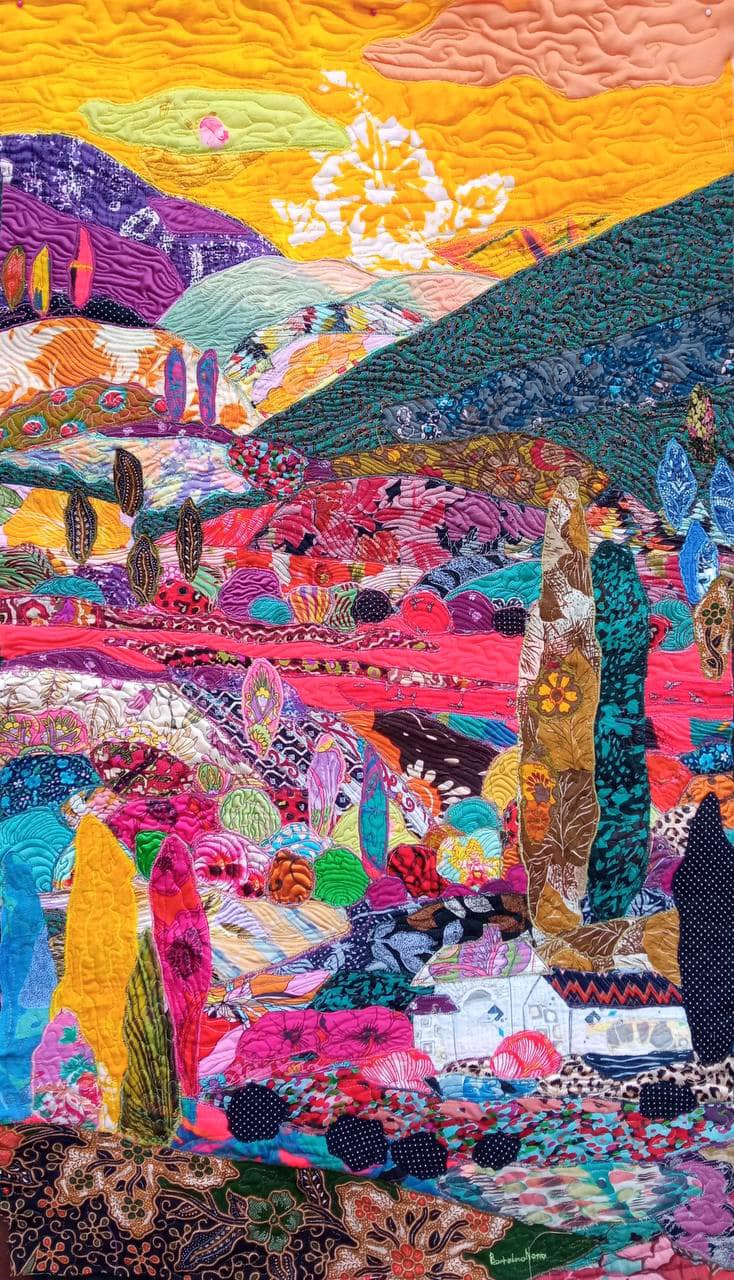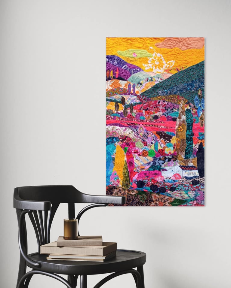 Technique: art quilt, quilt collage. I use fabric fragments of different colors, sizes and textures. I sew by hand and on a sewing machine.